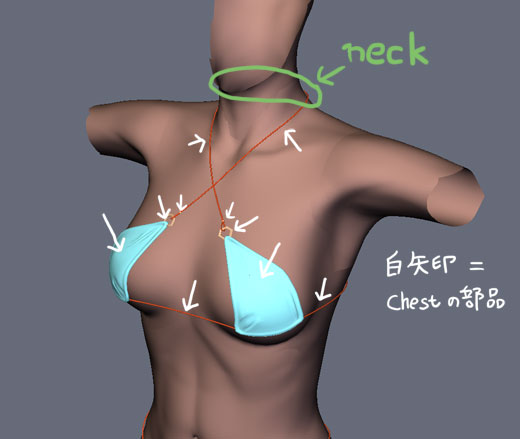 chestのmorphが爆発するわけだが、図のようにchestを構成する部品は複数存在する。modoではこれらにchestという名前の領域を割り当ててやるだけで、物理的に分割することなくposerに持ち込める。これがmodoの便利なところだ。