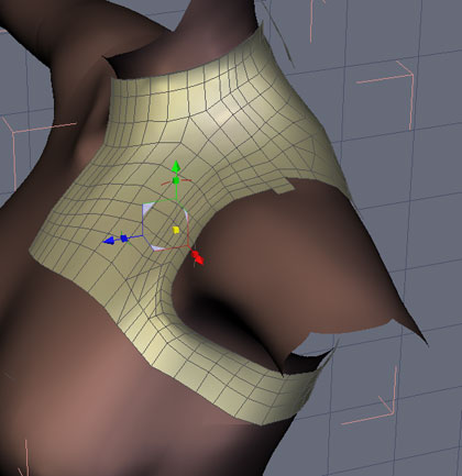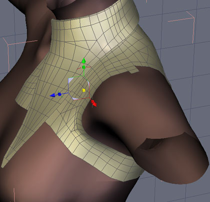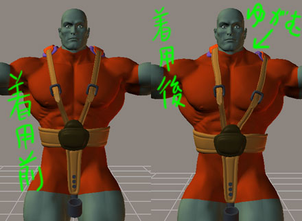 これは前回下駄を作ったときと同じ要領で、球状影響範囲とジョイント角度をいじって善処した。副作用で脇が食い込むので、補正morphが必要だ。