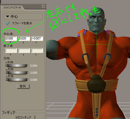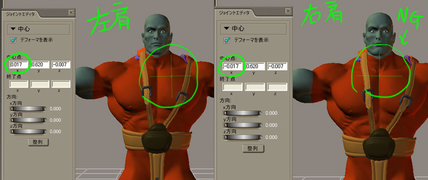 調べてみると、肩の中心点がずれていることが分かった。左右対称の数値が設定されているにもかかわらず、右肩だけ中心点が真ん中にある。数値を入れなおしても駄目だったので、両方とも中心点をゼロにしてやって強引に解決。