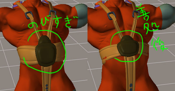 一番心配していたのが屈伸時のパーツの歪み具合だ。仁王立ちで少し上体を反らせたポーズを想定しているけど、ベルト中央が伸び過ぎだ。